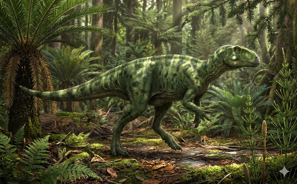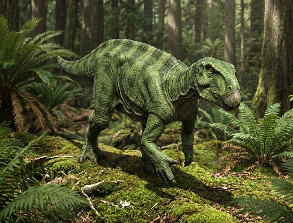 他のイグアノドン科の恐竜と同じように4本の脚で歩いていたと考えられており、前肢の親指には小さなスパイクの痕跡が見つかっています。口の前側には歯はなかったとされており、まるでクチバシのような形状をしていますが、口の奥には植物をすりつぶし咀嚼する為の歯列がビッシリと並んでいました。また、口に植物をためる為の頬袋があったのではないかとする説もあります。